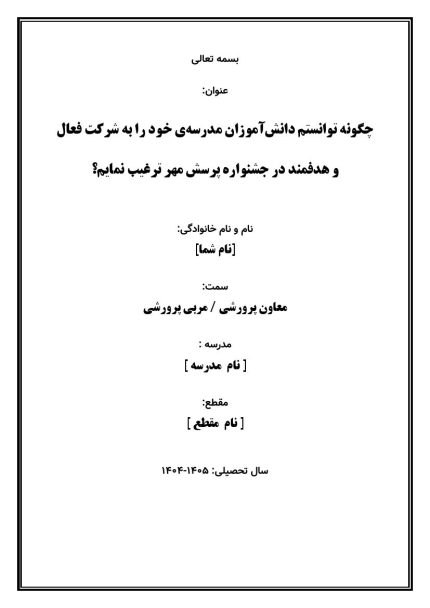 اقدام پژوهی با عنوان « چگونه توانستم دانش‌آموزان مدرسه‌ی خود را به شرکت فعال و هدفمند در جشنواره پرسش مهر ترغیب نمایم؟ » در قالب ورد و پی دی اف با قابلیت ویرایش می باشد که در فروشگاه معاون پرورشی آماده گردیده است .