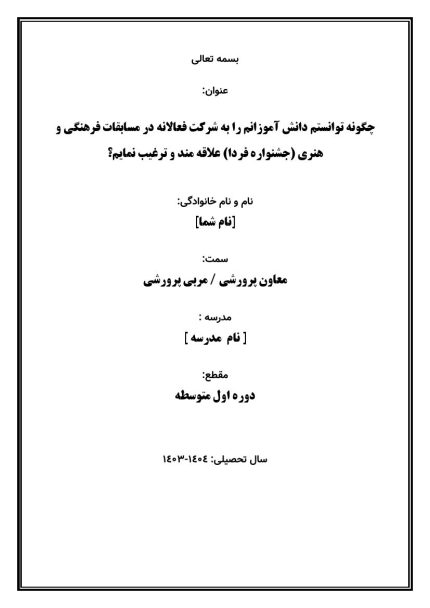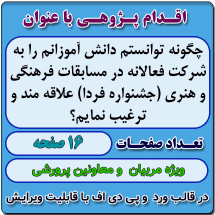 اقدام پژوهی با عنوان « چگونه توانستم دانش آموزانم را به شرکت فعالانه در مسابقات فرهنگی و هنری (جشنواره فردا) علاقه مند و ترغیب نمایم؟ » در قالب ورد و پی دی اف با قابلیت ویرایش می باشد که در فروشگاه معاون پرورشی آماده گردیده است .