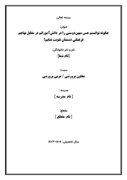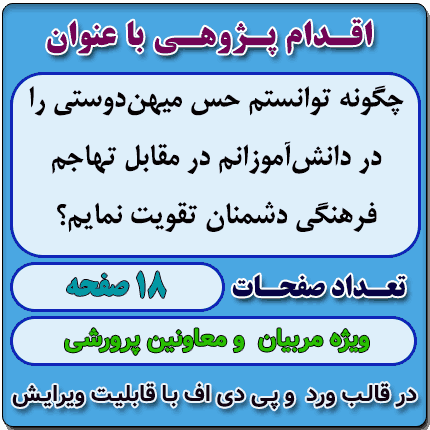 اقدام پژوهی با عنوان « چگونه توانستم حس میهن‌دوستی را در دانش‌آموزانم در مقابل تهاجم فرهنگی دشمنان تقویت نمایم؟ » در قالب ورد و پی دی اف با قابلیت ویرایش می باشد که در فروشگاه معاون پرورشی آماده گردیده است .