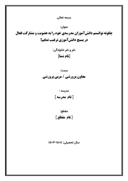 اقدام پژوهی با عنوان « چگونه توانستم با استفاده از روش‌های تلفیقیِ مشارکتی و  فناوری‌های نوین، دانش‌آموزانم را به شرکت مؤثر در فعالیت‌های پرورشی ترغیب کنم؟ » در قالب ورد و پی دی اف با قابلیت ویرایش می باشد که در فروشگاه معاون پرورشی آماده گردیده است .