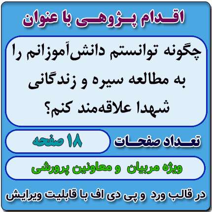 اقدام پژوهی با عنوان « چگونه توانستم دانش‌آموزانم را به  مطالعه سیره و زندگانی شهدا علاقه‌مند کنم؟ » در قالب ورد و پی دی اف با قابلیت ویرایش می باشد که در فروشگاه معاون پرورشی آماده گردیده است .