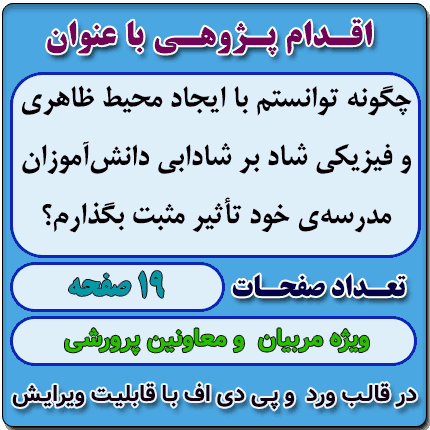 اقدام پژوهی با عنوان « چگونه توانستم با ایجاد محیط ظاهری و فیزیکی شاد بر شادابی دانش‌آموزان مدرسه‌ی خود تأثیر مثبت بگذارم؟ » در قالب ورد و پی دی اف با قابلیت ویرایش می باشد که در فروشگاه معاون پرورشی آماده گردیده است .