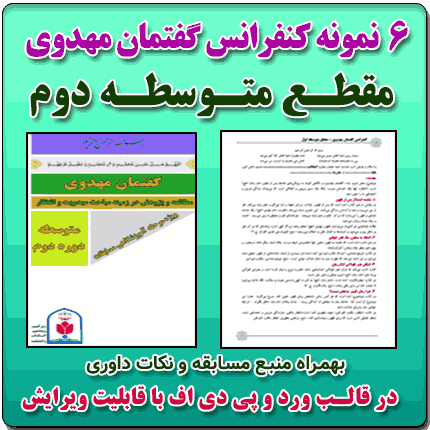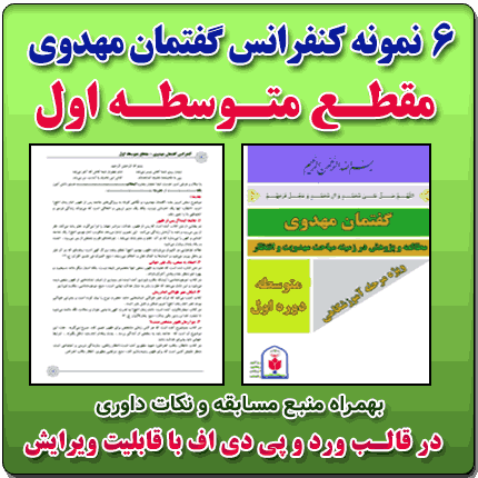 6 نمونه متن کنفرانس رشته گفتمان مهدوی مقطع متوسطه اول در قالب ورد و پی دی اف برای استفاده در مسابقات قرآن ، عترت و نماز بهمراه نکات داوری و منبع مسابقات در فروشگاه محصولات معاون پرورشی طراحی گردید .
