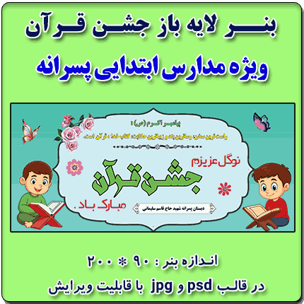 بنر لایه باز بنر جشن قرآن ویژه مدارس ابتدایی پسرانه در دو فایل psd و jpg در فروشگاه معاون پرورشی طراحی گردید .