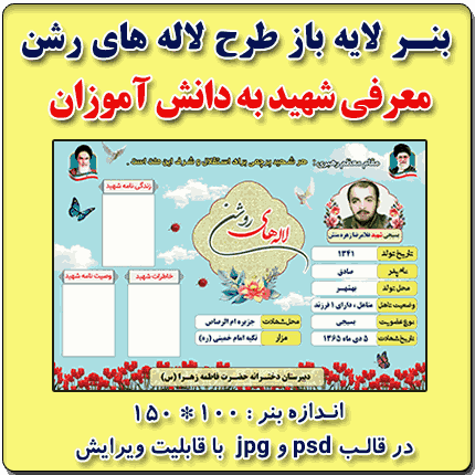 بنر لایه باز لاله های روشن ( معرفی شهید ) در دو فایل psd و jpg در فروشگاه معاون پرورشی طراحی گردید .