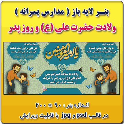 بنر لایه باز گرامیداشت ولادت حضرت علی (ع) و روز پدر مدارس پسرانه در دو فایل psd و jpg در فروشگاه معاون پرورشی طراحی گردید .