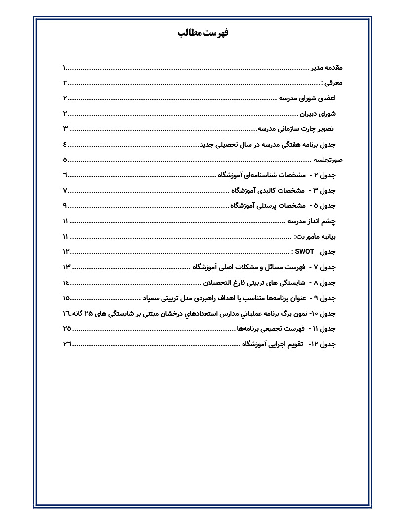 جدول – فهرست مسائل و مشکلات اصلی آموزشگاه