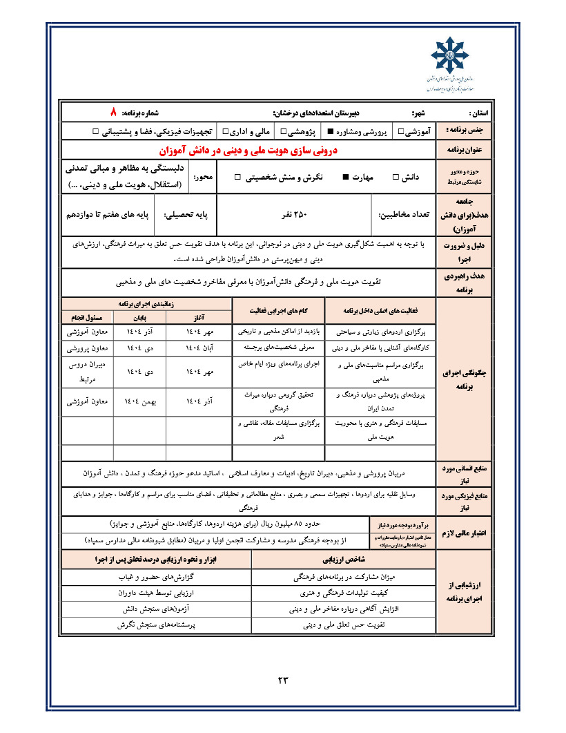 برنامه عملیاتی مبتنی بر شایستگی های 25 گانه مدل تربیتی مدارس تراز سمپاد 1405 – 1404 ویژه مدارس متوسطه اول ، دوم دخترانه و پسرانه استعدادهای درخشان در قالب ورد و پی دی اف توسط تیم مدیریت وبلاگ معاون پرورشی طراحی شده است . این برنامه در 43 صفحه و براساس شیوه نامه ارسالی از مدارس سمپاد آماده گردیده است .
