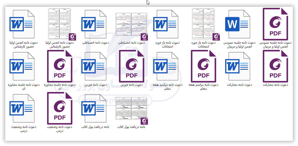 12 دعوت نامه : – دعوت نامه انجمن اولیا حضور کارشناس – دعوت نامه انضباطی – دعوت نامه خیرین – دعوت نامه باز خورد امتحانات – دعوت نامه جلسه عمومی انجمن اولیا – دعوت نامه جلسه مشاوره ای – دعوت نامه مراسم هفته معلم – دعوت نامه مشارکت – دعوت نامه وضعیت درسی – دعوت نامه یادواره شهدا – نامه دریافت پول کتاب