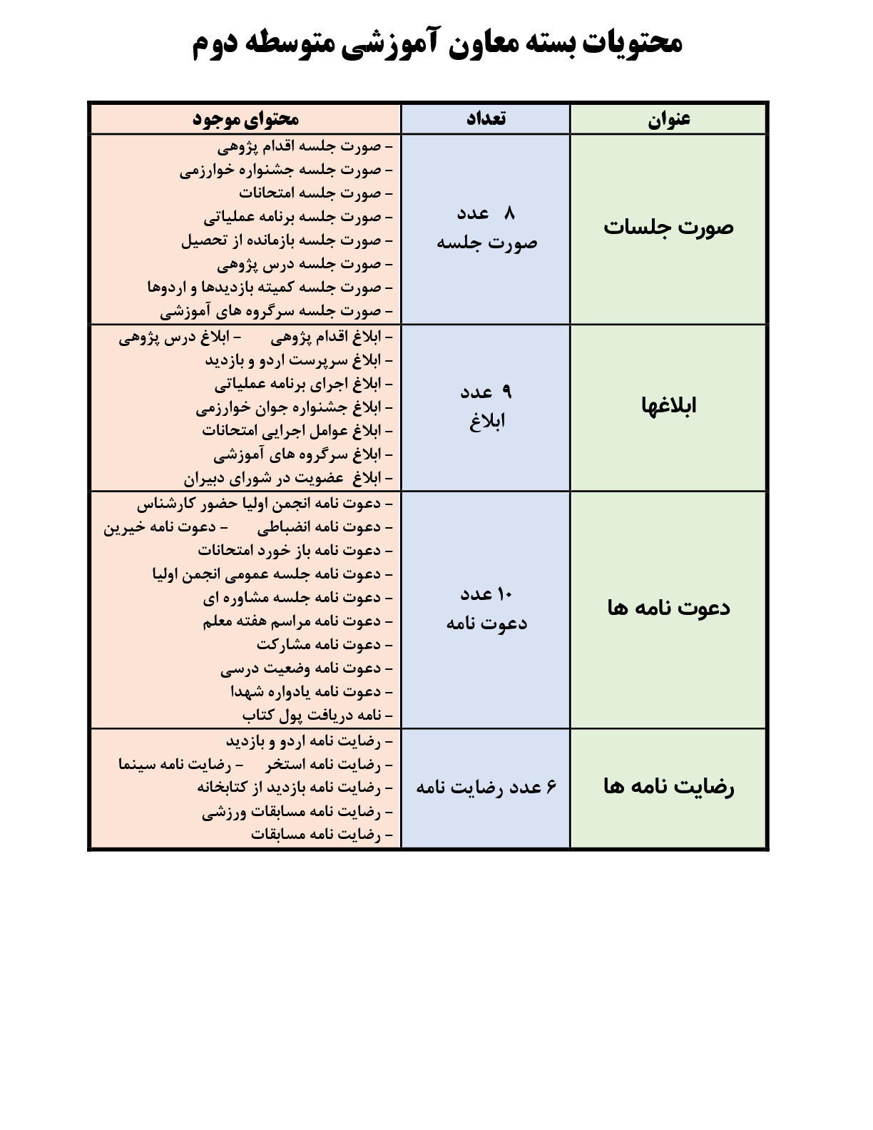 9صورت جلسه : – صورت جلسه اقدام پژوهی – صورت جلسه امتحانات – صورت جلسه بازمانده از تحصیل – صورت جلسه درس پژوهی – صورت جلسه برنامه سالانه – صورت جلسه کمیته بازدیدها و اردوها – صورت جلسه سرگروه های آموزشی