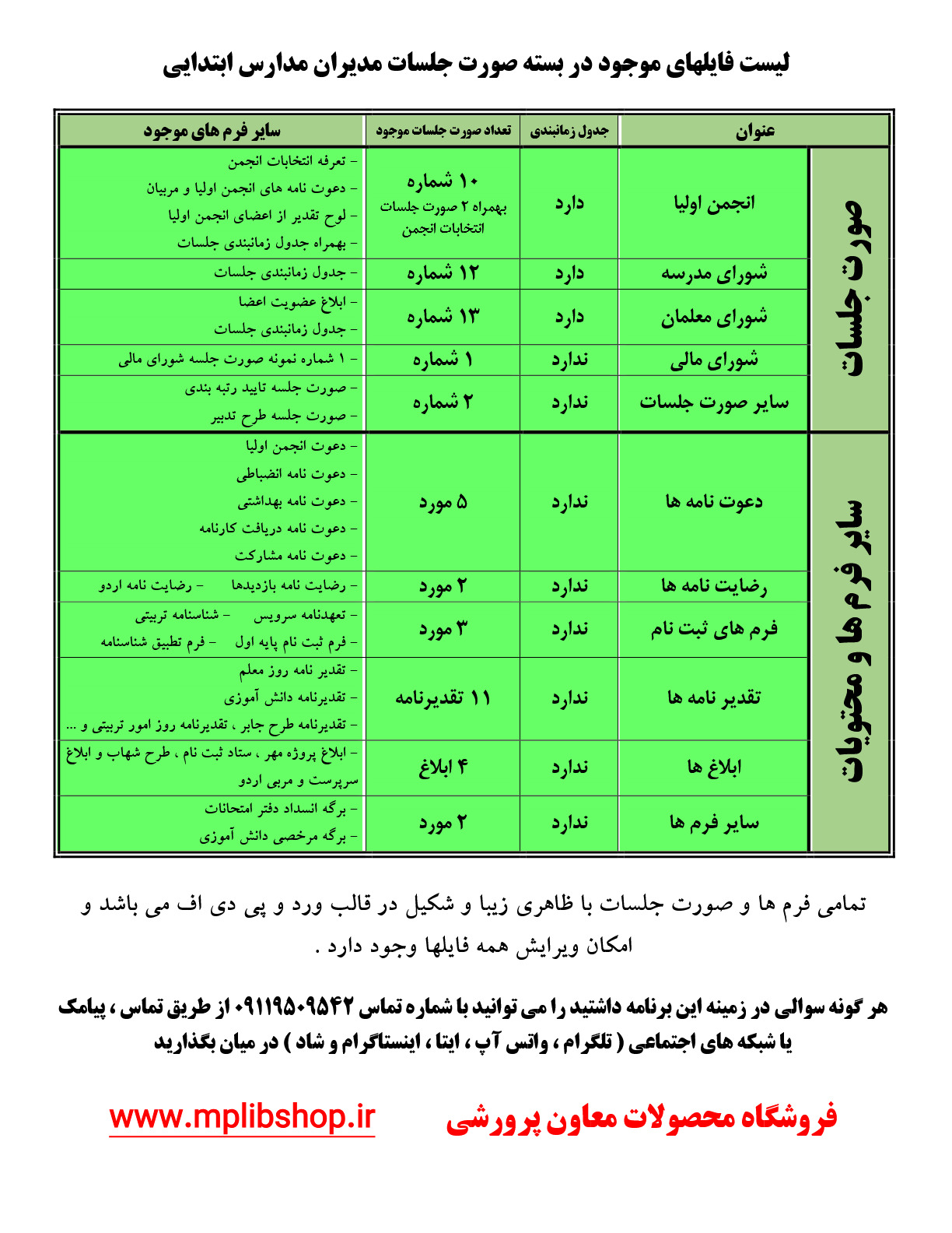 بسته صورت جلسات مدیران ابتدایی  شامل 40 صورت جلسه بهمراه جدول زمانبندی و فرمهای مورد نیاز در قالب ورد می باشد . این صورت جلسات با طرحی زیبا طراحی گردیده است . این بسته توسط تیم مدیریتی وبلاگ معاون پرورشی آماده گردید