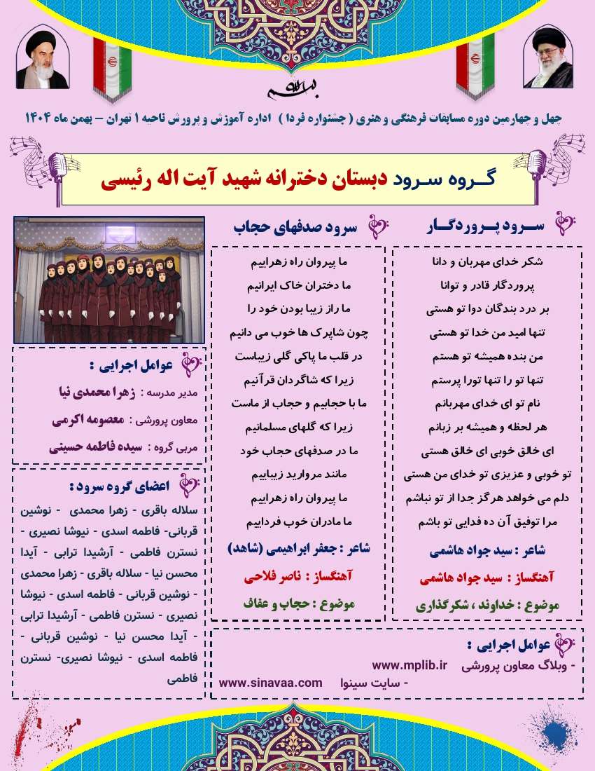 نمونه بروشور ویژه مسابقات سرود در یک صفحه به صورت زیبا وشکیل در اندازه a4 و رنگی در قالب ورد و پی دی اف در وبلاگ معاون پرورشی طراحی و تولید گردید . از این نمونه بروشور همکاران می توانند در مسابقات سرود استفاده کنند و مشخصات گروه خود را در آن ویرایش نمایند .