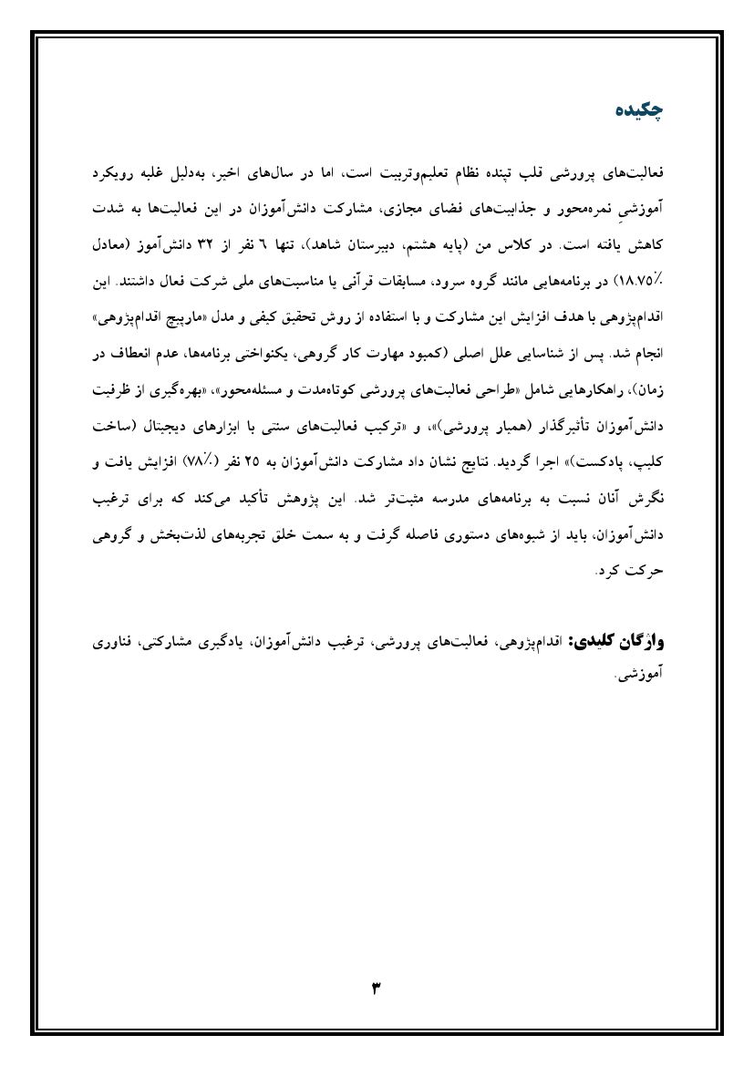 اقدام پژوهی با عنوان « چگونه توانستم با استفاده از روشهای تلفیقیِ مشارکتی و فناوریهای نوین، دانشآموزانم را به شرکت مؤثر در فعالیتهای پرورشی ترغیب کنم؟ » در قالب ورد و پی دی اف با قابلیت ویرایش می باشد که در فروشگاه معاون پرورشی آماده گردیده است .